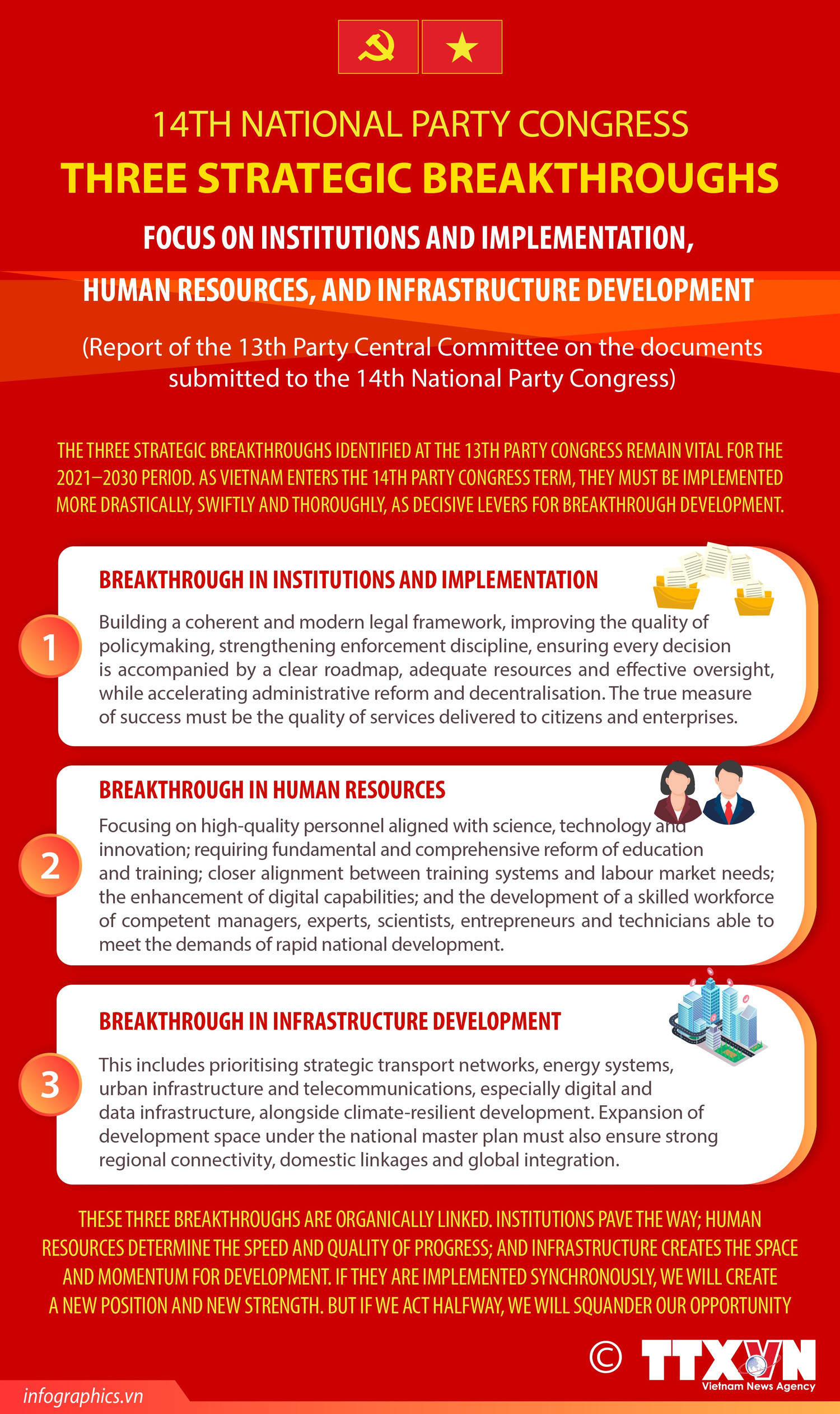 The Congress identified three strategic breakthroughs for the new term. The first is a strong breakthrough in development institutions, enhancing policy-making and implementation capacity to unlock, mobilise and effectively utilise all resources as competitive advantages, reduce compliance costs for people and businesses, and further decentralise and devolve powers between central and local levels, strengthening local autonomy and accountability.