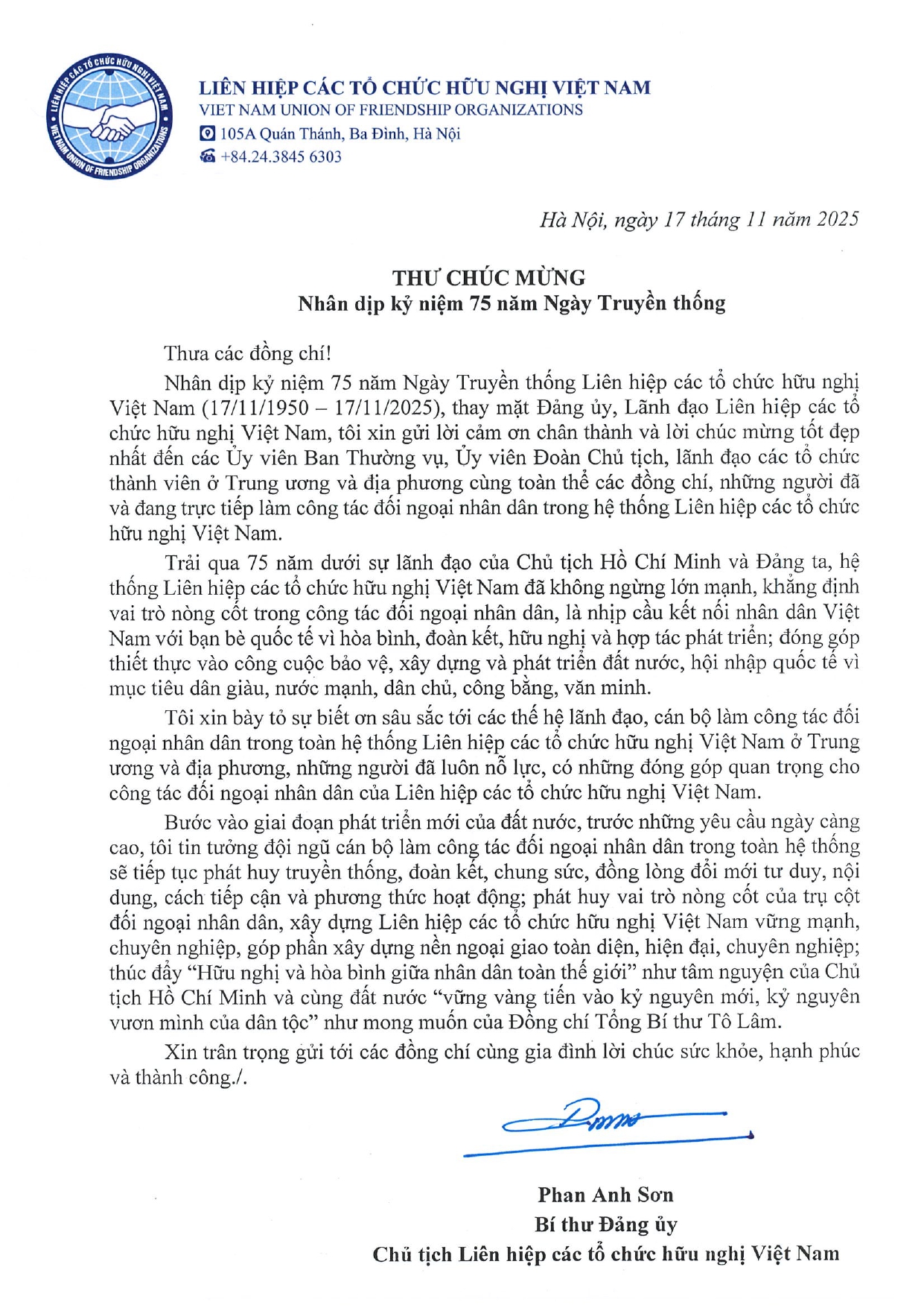 Nhân dịp kỷ niệm 75 năm ngày truyền thống Liên hiệp các tổ chức hữu nghị Việt Nam (17/11/1950 - 17/11/2025), Chủ tịch Liên hiệp các tổ chức hữu nghị Việt Nam Phan Anh Sơn gửi lời chúc mừng tốt đẹp nhất đến các Ủy viên Ban Thường vụ, Ủy viên Đoàn Chủ tịch, lãnh đạo các tổ chức thành viên ở trung ương và địa phương cùng toàn thể đội ngũ làm công tác đối ngoại nhân dân trong hệ thống Liên hiệp các tổ chức hữu nghị Việt Nam.