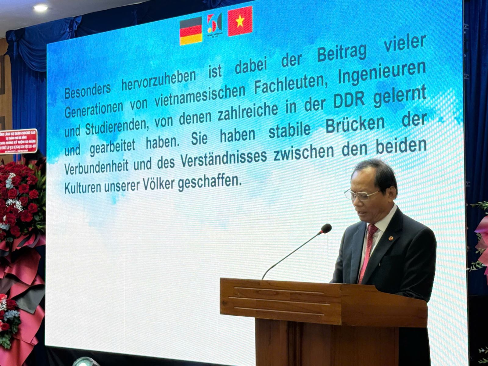 Phát biểu chào mừng và diễn văn kỷ niệm, thay mặt Ban Tổ chức, ông Nguyễn Hữu Lai, Chủ tịch Hội hữu nghị Việt Nam - Đức thành phố cũng đã ôn lại những kết quả đạt được trong mối quan hệ hợp tác giữa hai nước Việt Nam và Đức nói chung, thành phố Đà Nẵng nói riêng với các địa phương của Đức trong thời gian qua trong các lĩnh vực kinh tế, văn hóa, du lịch, chính trị - ngoại giao. Đặc biệt, trong lĩnh vực đầu tư, thành phố hiện có 28 dự án FDI của Đức đăng ký đầu tư tại thành phố Đà Nẵng với tổng vốn đầu tư khoảng 671,4 triệu USD. Các doanh nghiệp Đức hoạt động trong nhiều lĩnh vực, tiêu biểu như: công nghiệp chế biến - chế tạo chiếm tỷ trọng lớn, với tổng vốn đầu tư khoảng 654,2 triệu USD; dịch vụ với tổng vốn khoảng 17,2 triệu USD; … Ngoài ra, hằng năm thành phố đón tiếp nhiều đoàn doanh nghiệp Đức đến tìm hiểu về môi trường đầu tư của thành phố, trong đó có các đoàn do Bộ Kinh tế và Công nghiệp CHLB Đức giới thiệu. Theo ông, những kết quả này không chỉ khẳng định nền tảng hợp tác vững chắc đã được xây dựng giữa Đà Nẵng và các đối tác Đức, mà còn góp phần mang lại lợi ích thiết thực cho nhân dân hai nước, đồng thời đóng góp góp phần tích cực cho hòa bình, hợp tác và phát triển trong khu vực cũng như trên thế giới. Ông hy vọng, thông qua chương trình, không chỉ giúp hai nước nhìn lại thành tựu đã đạt được, mà còn tiếp thêm động lực, mở ra viễn cảnh hợp tác mới, sâu sắc và hiệu quả hơn nữa giữa hai nước nói chung, giữa thành phố Đà Nẵng và các đối tác Đức nói riêng trong thời gian đến.